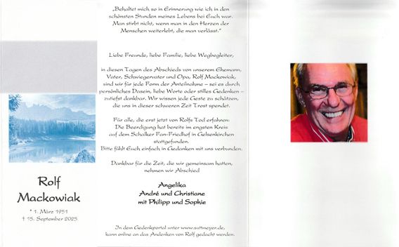 Uns hat die Nachricht erreicht, das unser lieber Vereinskamerad Rolf Mackowiak leider bereits am 15.September dieses Jahres verstorben ist.